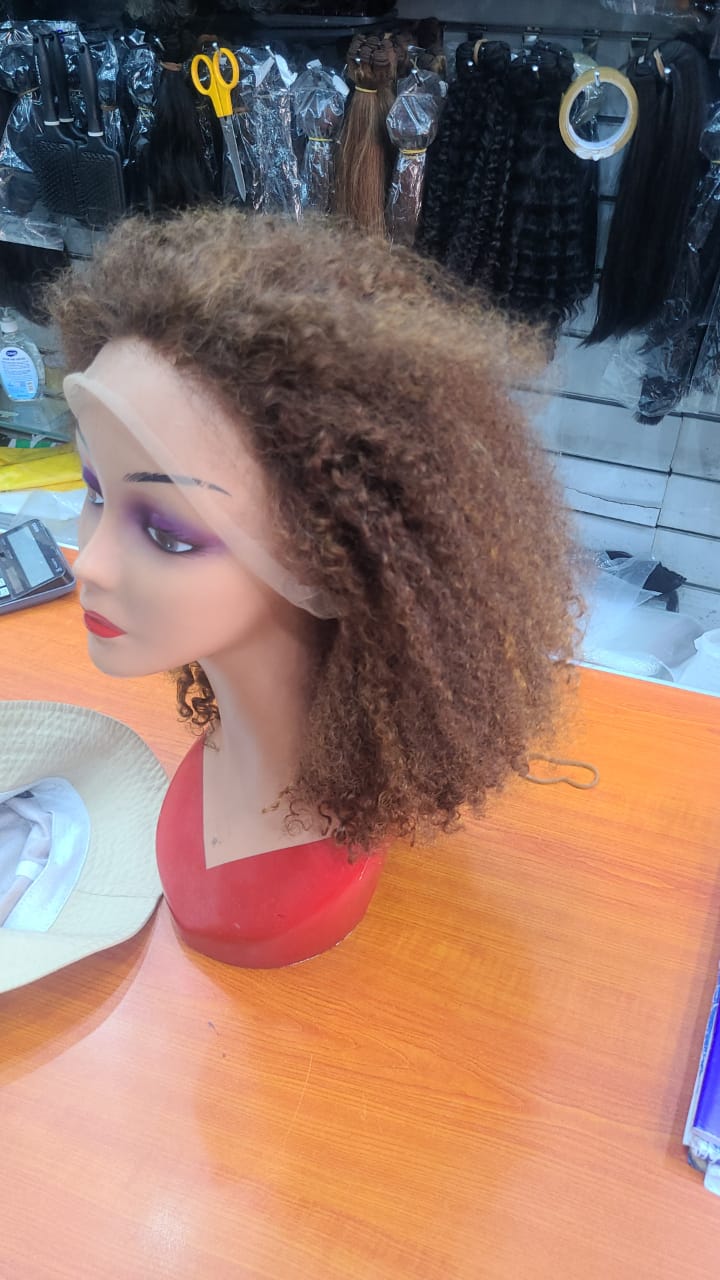 Color: Brown/Auburn Blend, Texture: Afro Kinky Curly, Type: Lace Front, Length: Shoulder-Length
