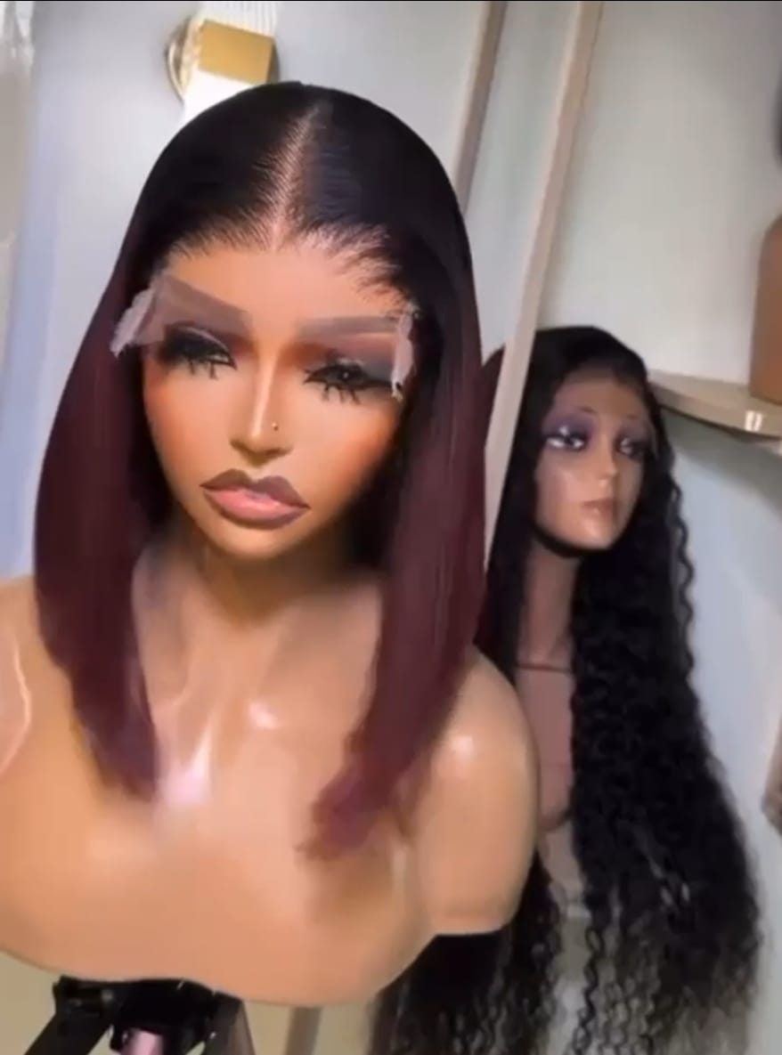 Step out in style with this sharp, sophisticated straight bob wig. The custom color features a seamless transition from a natural dark root to a rich, glossy burgundy/wine shade on the ends. This wig is a frontal unit, meaning the lace provides a natural-looking, pre-plucked hairline and a perfect deep part. The short length is low-maintenance, edgy, and effortlessly chic.