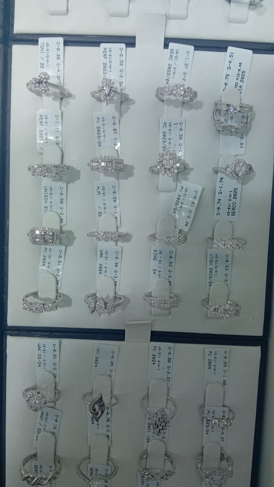 A display tray featuring various white gold and diamond rings, including simple solitaire clusters, butterflies, and intricate multi-stone bands.