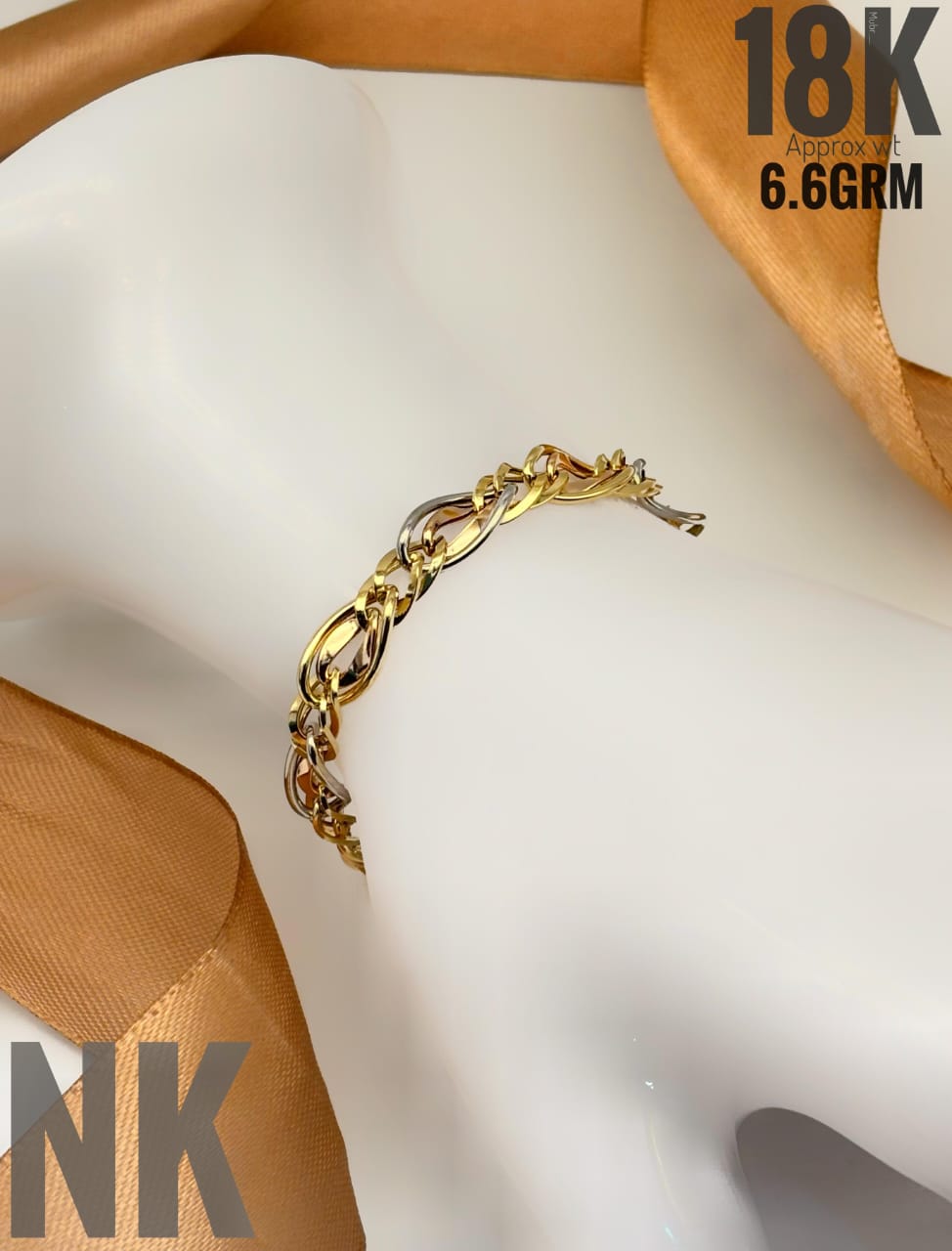 This fluid and sophisticated 18K Tri-Color Gold Bracelet features smooth, wavy links that beautifully intertwine. An eye-catching piece weighing approximately 6.6 GRM.