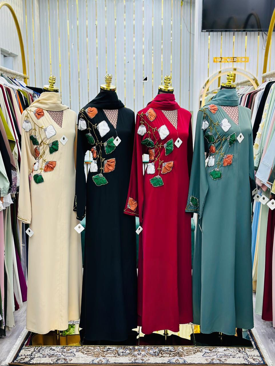 Elevate your wardrobe with a piece that speaks volumes. Our Bold Blossom Abaya is designed for the woman who appreciates fine craftsmanship. The focal point of this garment is the stunning, multi-colored floral arrangement that starts at the shoulder and flows gracefully down the bodice, mirrored by delicate accents on the cuffs.