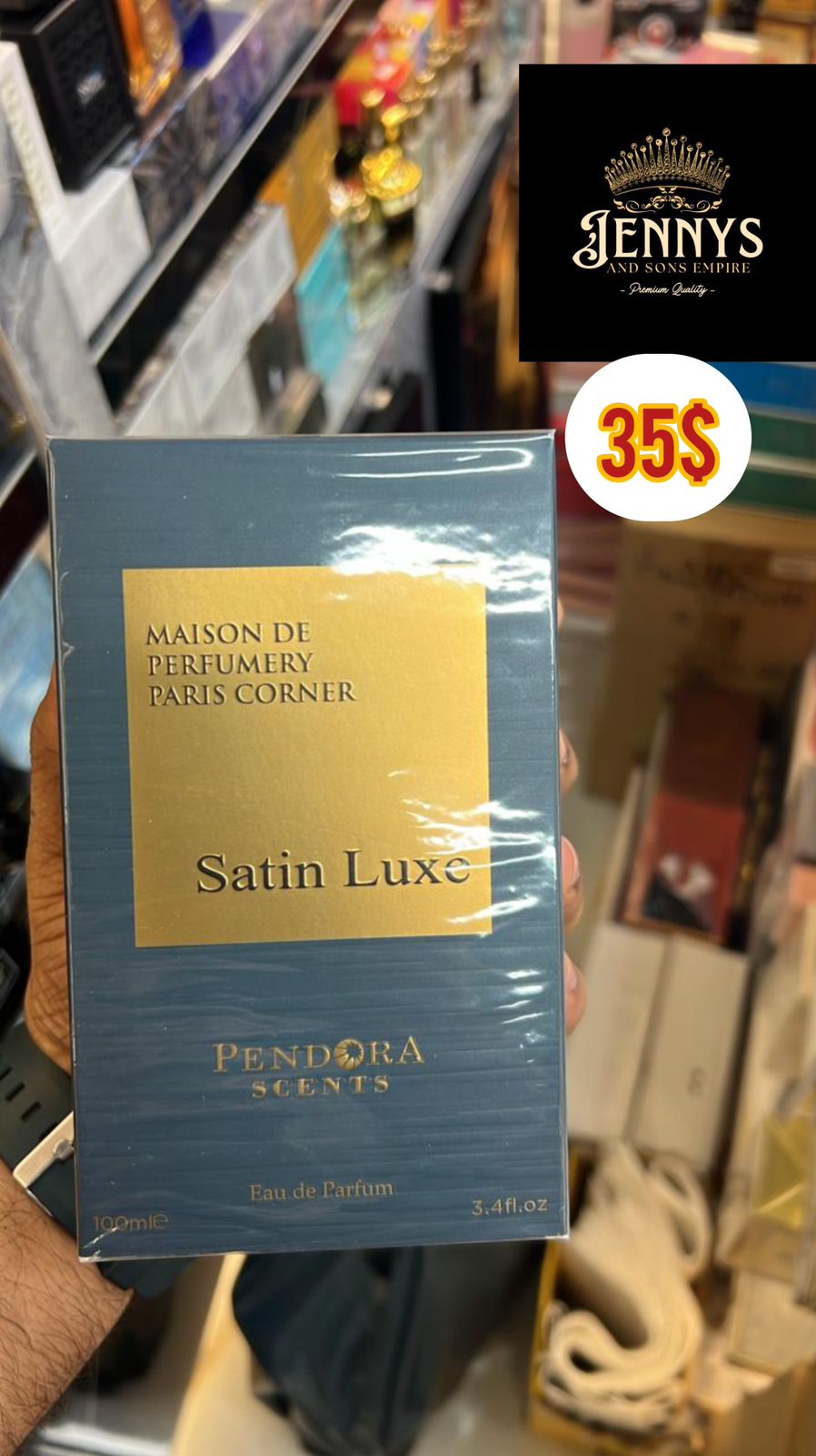 Marketed as “Satin Luxe” from Maison De Perfumery Paris Corner, this fragrance evokes a smooth, luxurious, and opulent feeling. The rich blue and gold box suggests a high-quality, possibly powdery or vanilla-based scent, perfect for elegance and refinement.