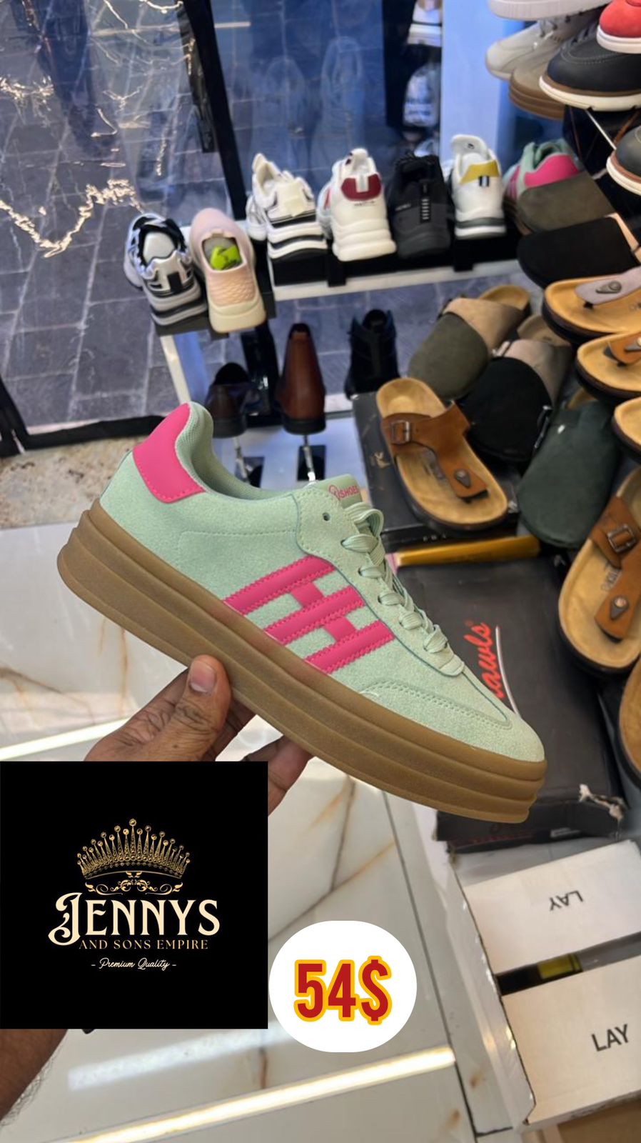 Retro-inspired suede sneaker with a thick, stacked gum rubber platform sole. Features a mint green body with bold hot pink accents on the heel tab and side logo. Perfect for a vibrant, casual look.