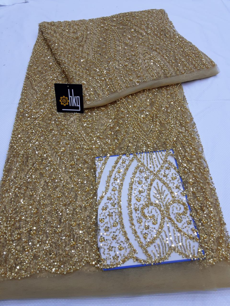 Nothing says “Royalty” like Champagne Gold. This lace is fully embroidered with shimmering gold sequins and beads, providing a weighted, expensive drape that is perfect for milestone celebrations.