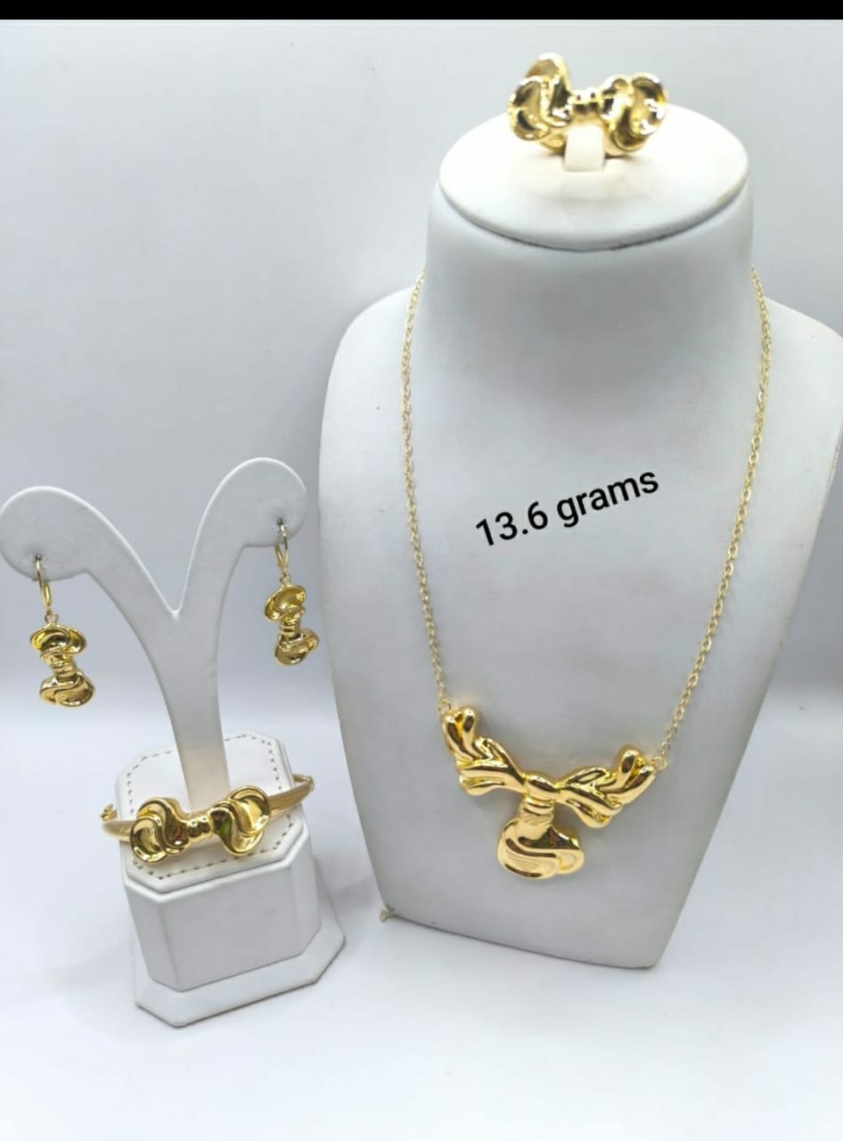 A delicate and feminine jewelry set featuring a smooth, highly-polished ribbon bow design. The necklace showcases a substantial bow pendant, complemented by a matching open bangle, small drop earrings, and a statement ring. This set is ideal for a graceful and coordinated look.