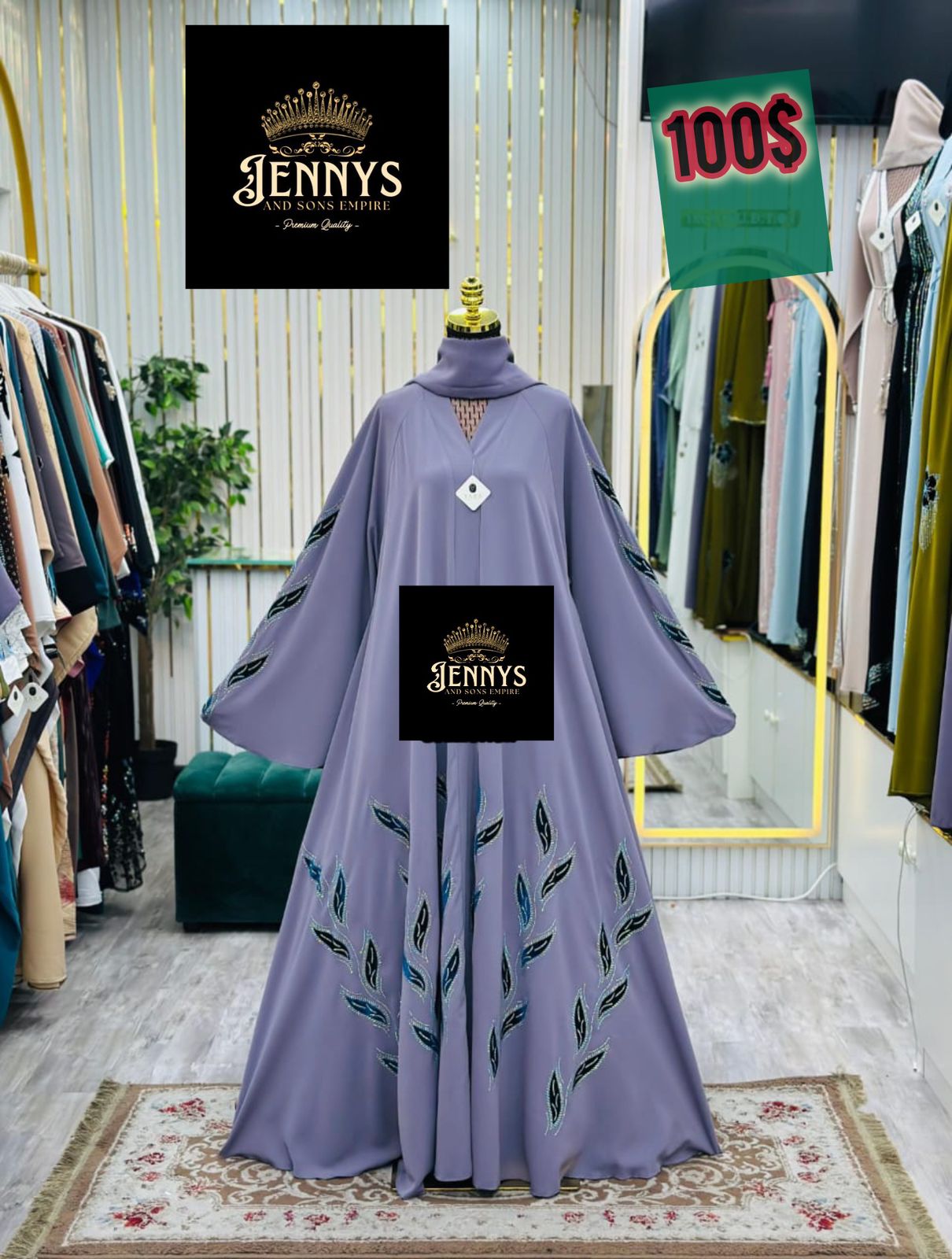 Title The Lilac Flowing Abaya with Abstract Leaf Applique